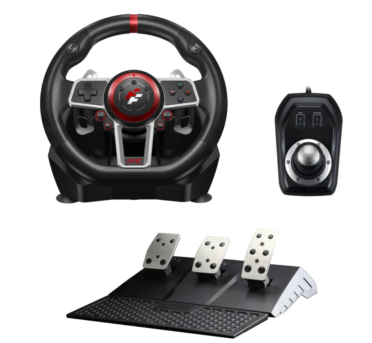 Satisfaisez votre besoin de vitesse avec l'ES900S 6 en 1. Cet ensemble de course complet comprend un volant à vibrations, un levier de vitesses en H séparé et un pédalier avec pédale d'embrayage dédiée. Compatible avec PC, PS3, PS4, Xbox 360, XBOX ONE et Nintendo Switch.