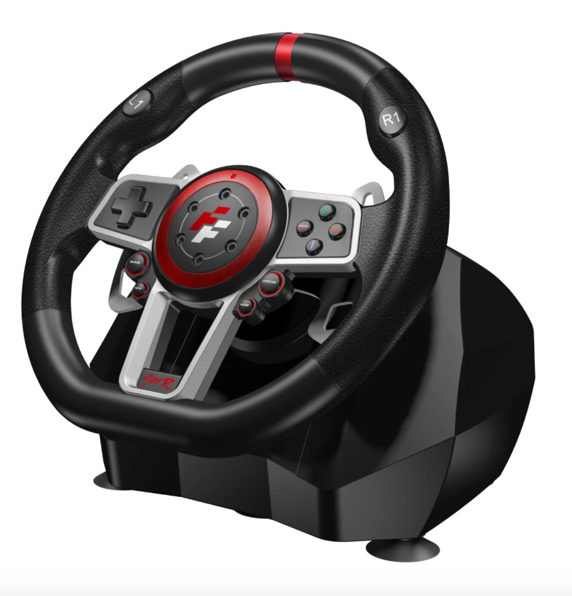 Rotation réglable (270 et 900 degrés) du volant avec contours ergonomiques et poignée recouverte de caoutchouc.